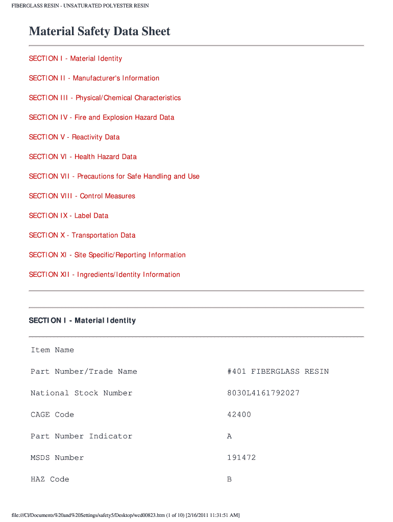 FIBERGLASS RESIN UNSATURATED POLYESTER RESIN Material Safety Data Sheet SECTION I Material Identity SECTION II Manufacturer's Information SECTION III Physical/Chemical Characteristics SECTION IV Fire