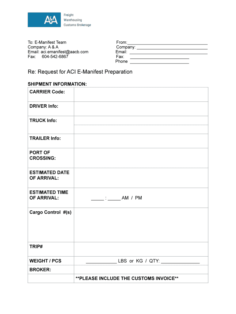To: Manifest Team Company: A & A Email: ACI. Manifest aacb.com Fax: 6045426867 From: Company: Email: Fax: Phone Re: Request for ACI Manifest Preparation SHIPMENT INFORMATION: CARRIER Code: DRIVER