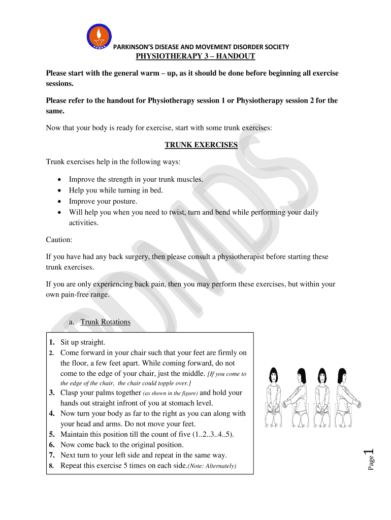 PARKINSON DISEASE AND MOVEMENT DISORDER SOCIETYPHYSIOTHERAPY 3 HANDOUT Please start with the general warm up, as it should be done before beginning all exercise sessions. Please refer to the handout