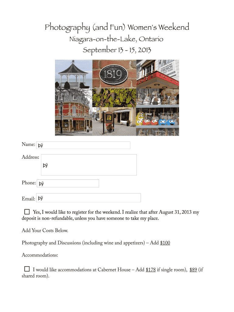 Photography (and Fun) Women's Weekend NiagaraontheLake, Ontario September 13 15, 2013 Name: Address: Phone: Email: Yes, I would like to register for the weekend. I realize that after August 31, 2013,