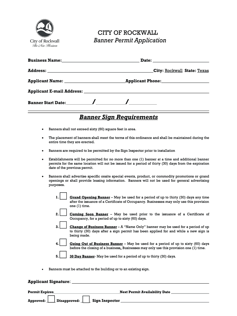 CITY OF ROCKWELL Banner Permit Application Business Name: Date: City: Rockwell State: Texas Address: Applicant Name: Applicant Phone: Applicant Email Address: / / Banner Start Date: Banner Sign Requirements