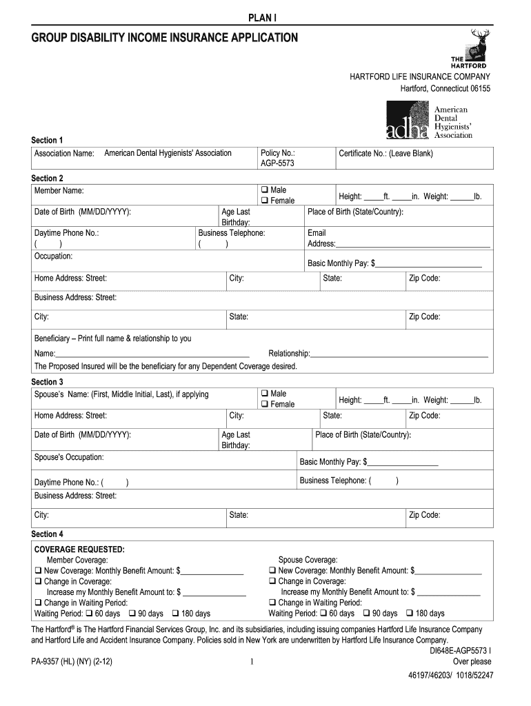 PLAN GROUP DISABILITY INCOME INSURANCE APPLICATION HARTFORD LIFE INSURANCE COMPANY Hartford, Connecticut 06155Section 1 Association Name:American Dental Hygienists AssociationSection 2 Member Name:Policy