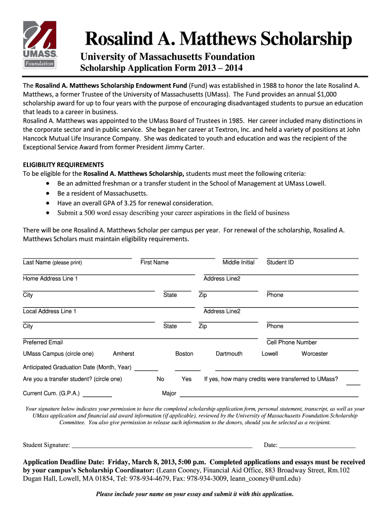 This document is an application form for the Rosalind A. Matthews Scholarship, which supports disadvantaged students pursuing business education at UMass.