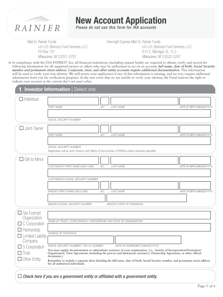 New Account Application Please do not use this form for IRA accounts Mail to: Rainier Funds c/o U.S. Ban corp Fund Services, LLC PO Box 701 Milwaukee, WI 532010701 Overnight Express Mail To: Rainier