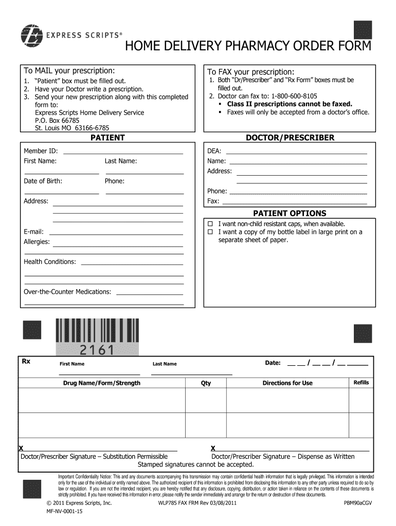 HOME DELIVERY PHARMACY ORDER FORM To MAIL your prescription: To FAX your prescription: 1. Patient box must be filled out. 2. Have your Doctor write a prescription. 3. Send your new prescription along