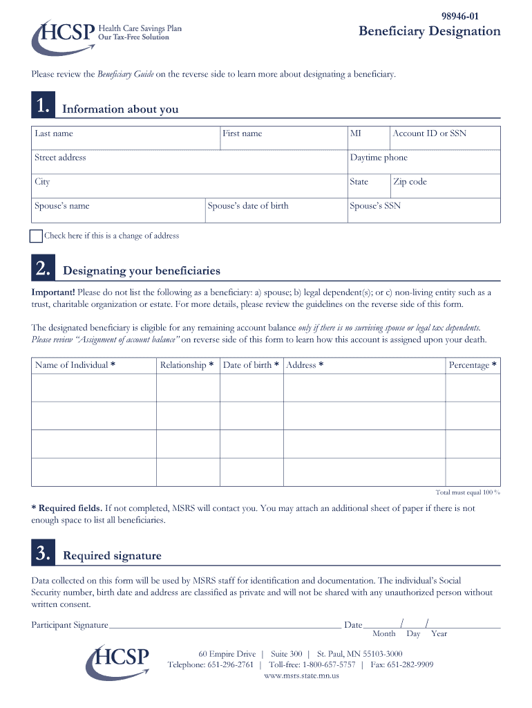 9894601 Beneficiary Designation Please review the Beneficiary Guide on the reverse side to learn more about designating a beneficiary. 1. Information about you Last name First name MI Account ID or