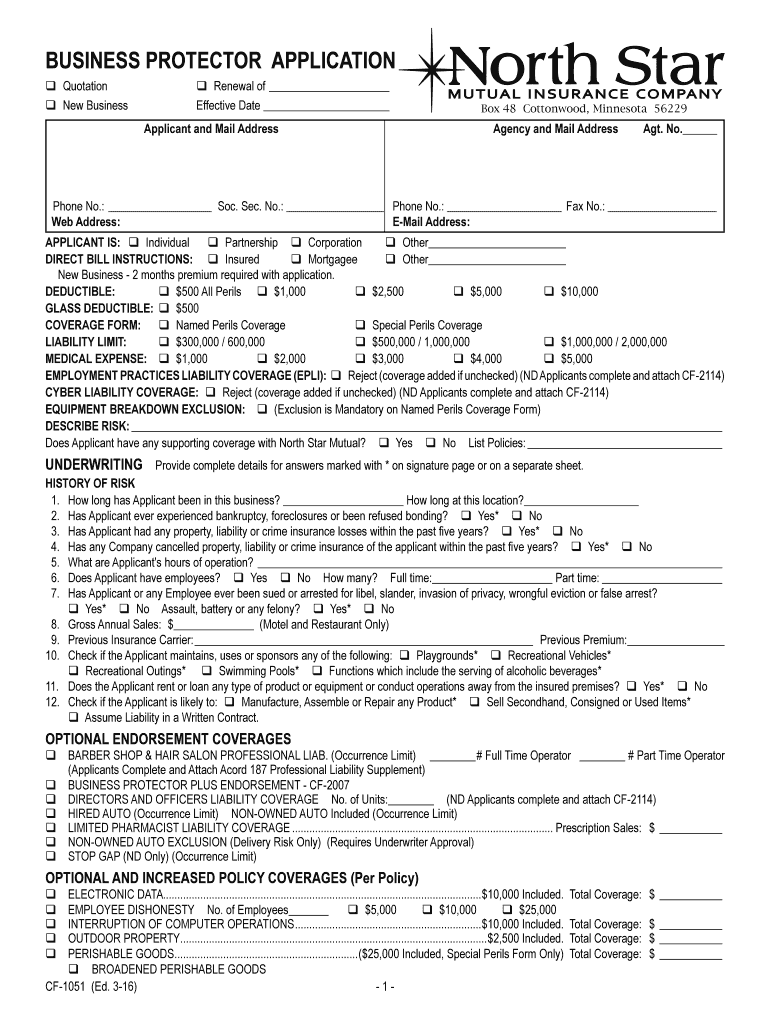 Business PROTECTOR application Quotation New Business Renewal of Effective Date Box 48 Cottonwood, Minnesota 56229 Applicant and Mail Address Agency and Mail Address. No. Phone No.: Soc. Sec. No.: