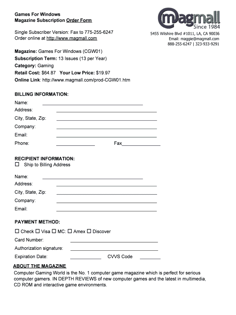 Games For Windows Magazine Subscription Order Form Single Subscriber Version: Fax to 7752556247 Order online at http://www.magmall.com 5455 Wilshire Blvd #1011, LA, CA 90036 Email: Maggie magmall.com