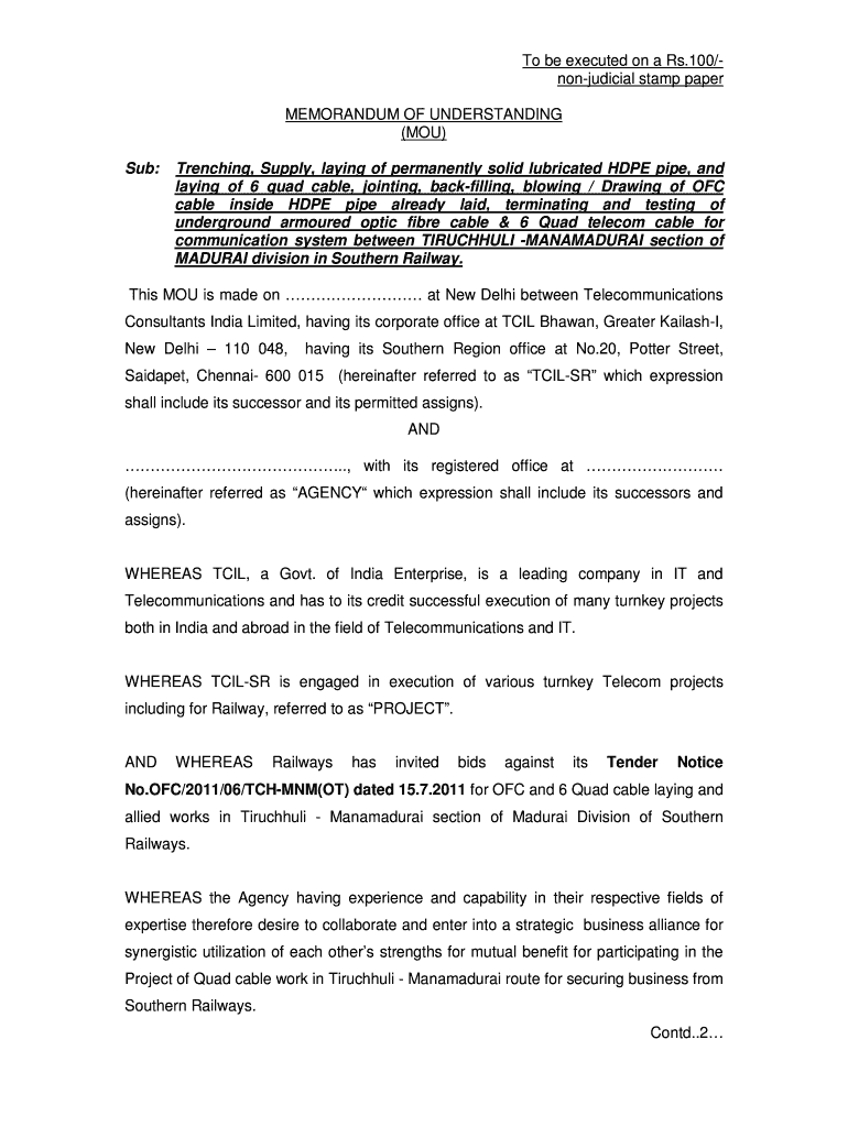 To be executed on a Rs.100/nonjudicial stamp paper MEMORANDUM OF UNDERSTANDING (YOU) Sub:Trenching, Supply, laying of permanently solid lubricated HDPE pipe, and laying of 6 quad cable, jointing,