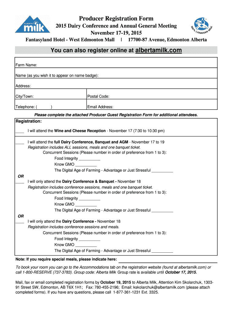 Producer Registration Form 2015 Dairy Conference and Annual General Meeting November 1719, 2015 Fantasy land Hotel West Edmonton Mall 1770087 Avenue, Edmonton Alberta You can also register online