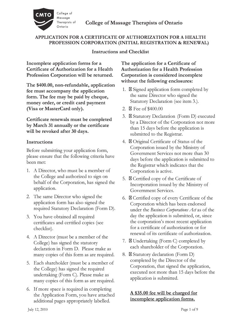 College of Massage Therapists of Ontario APPLICATION FOR A CERTIFICATE OF AUTHORIZATION FOR A HEALTH PROFESSION CORPORATION (INITIAL REGISTRATION & RENEWAL) Instructions and Checklist Incomplete application