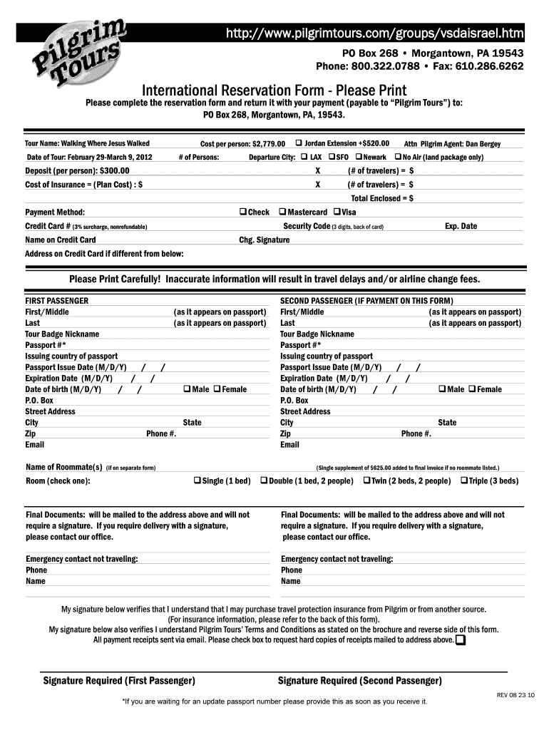 HTTP://www.pilgrimtours.com/groups/vsdaisrael.htm PO Box 268 Morgantown, PA 19543 Phone: 800.322.0788 Fax: 610.286.6262 International Reservation Form Please Print Please complete the reservation