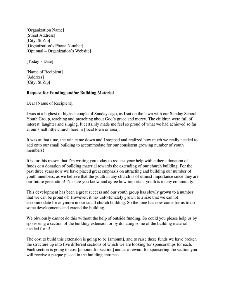 Organization Name Street Address City, St Zip Organizations Phone Number Optional Organizations Website Today's Date Name of Recipient Address City, St Zip Request for Funding and/or Building Material