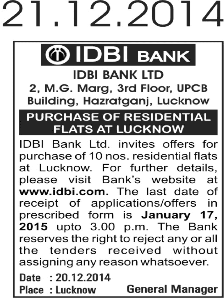 Notice Inviting Tender Purchase of 10 Residential Flats at Lucknow IDB Bank Limited (the Bank) is a company incorporated and registered under the Companies Act, 1956 and a banking company under section