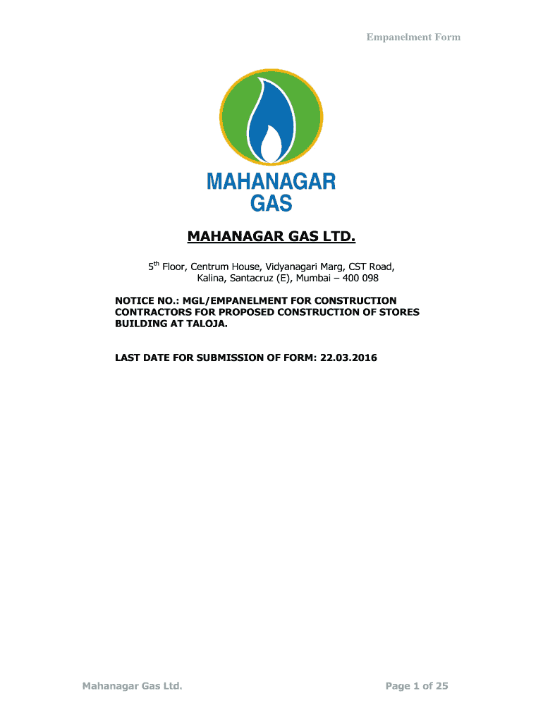Embankment Form MANAGER GAS LTD. 5th Floor, Cent rum House, Vijayanagar Mary, CST Road, Karina, Santacruz (E), Mumbai 400 098 NOTICE NO.: MEL/EMBANKMENT FOR CONSTRUCTION CONTRACTORS FOR PROPOSED CONSTRUCTION