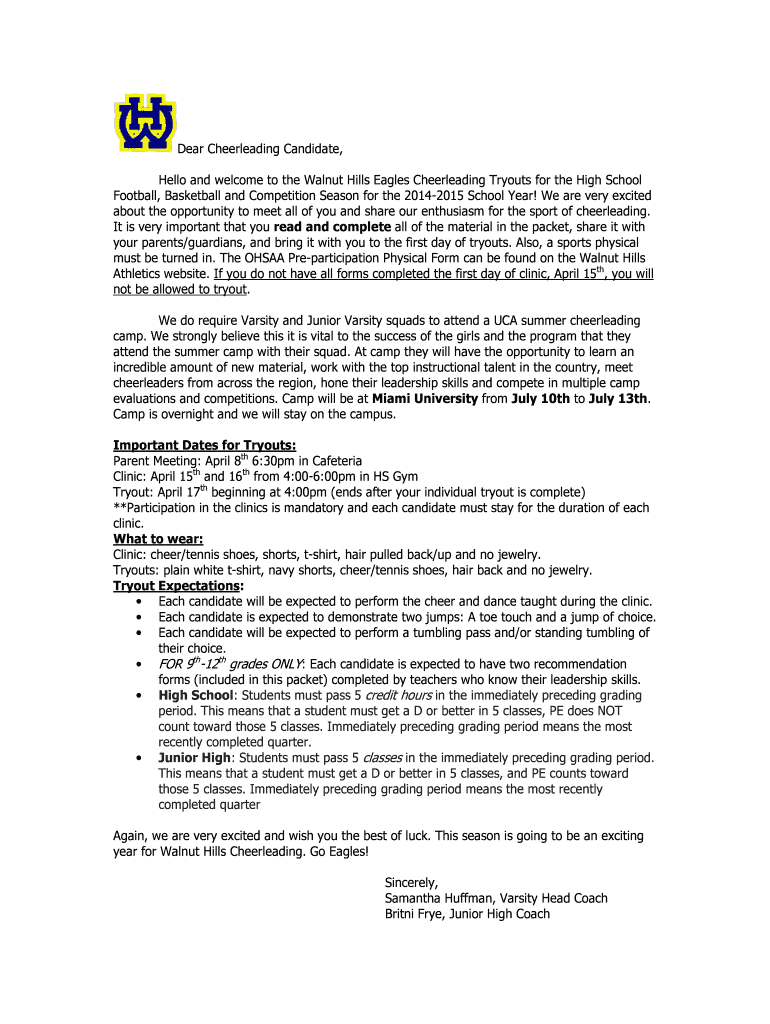 Get the free Dear Cheerleading Candidate - Walnut Hills High School