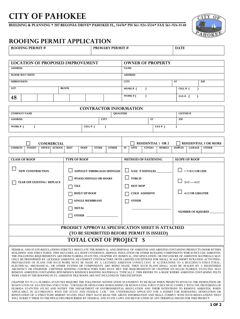 CITY OF PAROLEE BUILDING & PLANNING * 207 BEGONIA DRIVE* PAROLEE FL, 33476* PH 5619245534* FAX 5619248140 ROOFING PERMIT APPLICATION ROOFING PERMIT # PRIMARY PERMIT # DATE LOCATION OF PROPOSED IMPROVEMENT