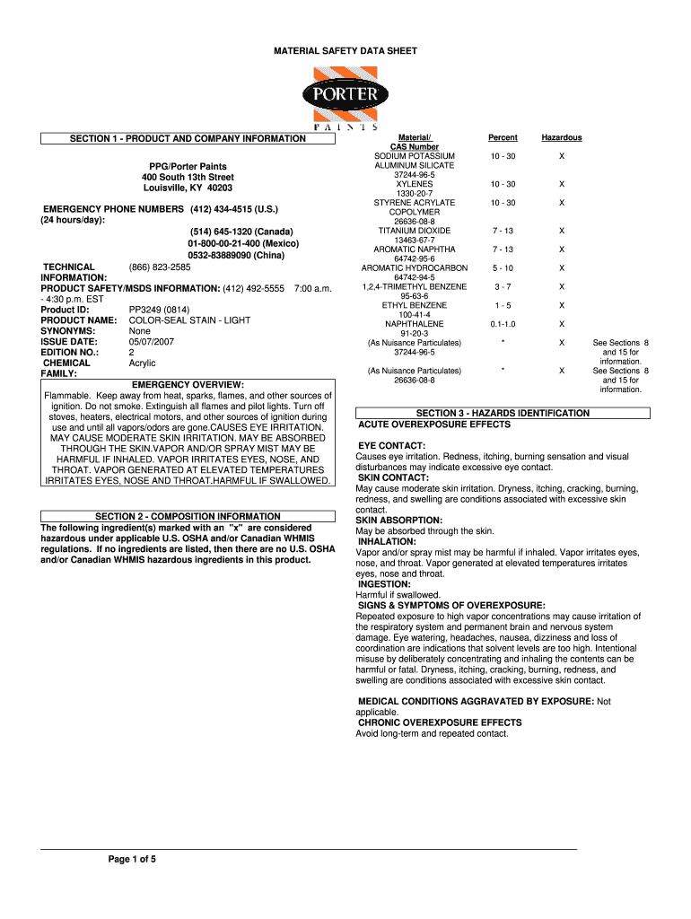 MATERIAL SAFETY DATA SHEET SECTION 1 PRODUCT AND COMPANY INFORMATION RPG/Porter Paints 400 South 13th Street Louisville, KY 40203 EMERGENCY PHONE NUMBERS (412) 4344515 (U.S.) (24 hours/day): (514)