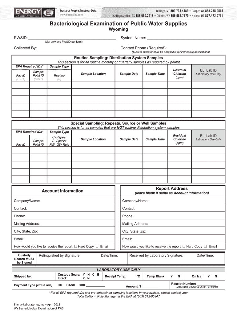 Bacteriological Examination of Public Water Supplies Wyoming PW SID: System Name: (List only one PW SID per form) Collected By: Contact Phone (Required): (System operator must be accessible for immediate
