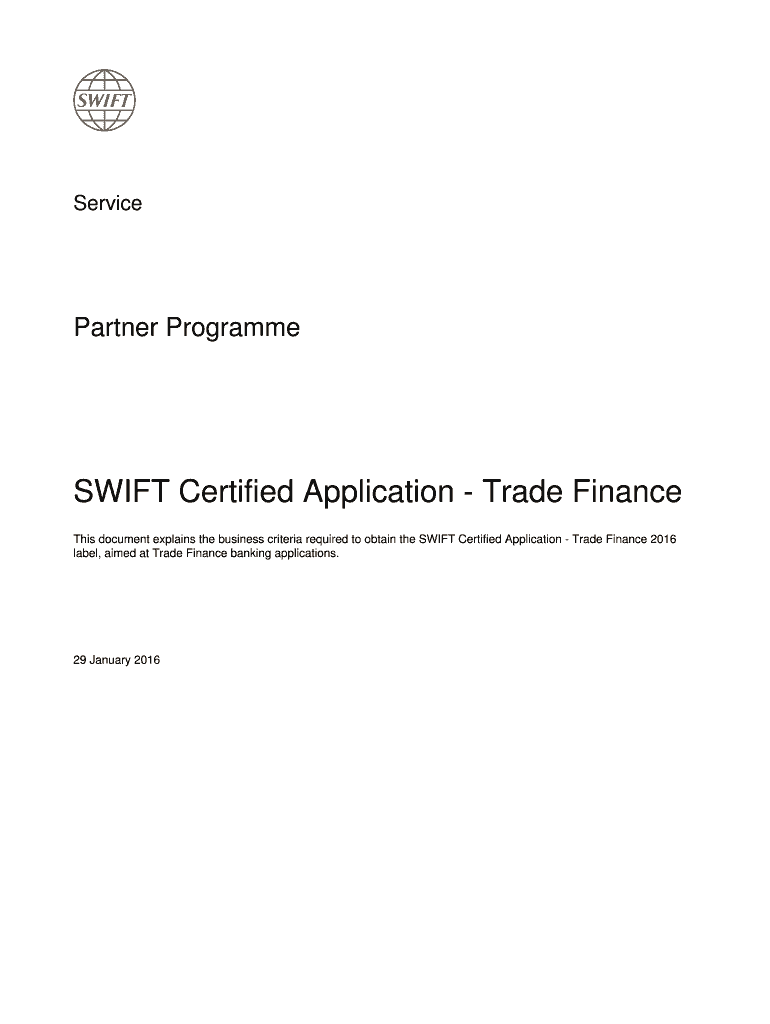 Service Partner Program SWIFT Certified Application Trade Finance This document explains the business criteria required to obtain the SWIFT Certified Application Trade Finance 2016 label, aimed at