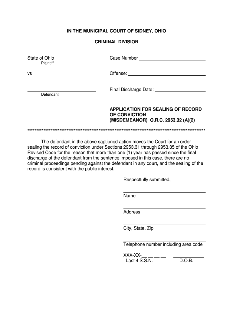 Plaintiff vs. Offense: Final Discharge Date: Defendant. APPLICATION FOR SEALING OF RECORD. OF CONVICTION. (MISDEMEANOR) O.R.C. 2953.32 (A)(2).