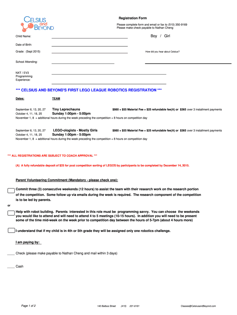 Registration Form Please complete form and email or fax to (510) 3509169 Please make check payable to Nathan Cheng Boy / Girl Child Name: Date of Birth: Grade: (Sept 2015) How did you hear about Celsius?