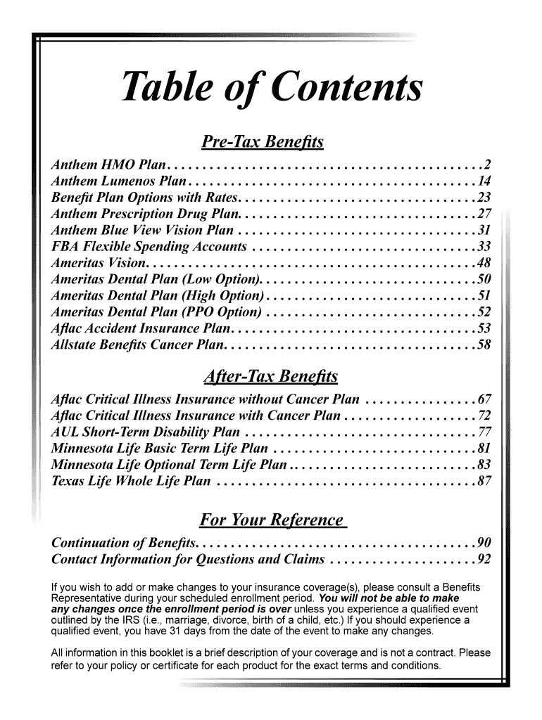 Table of Contents Pretax Benefits Anthem HMO Plan 2 Anthem Lumens Plan. . . . . . . . . . . . .