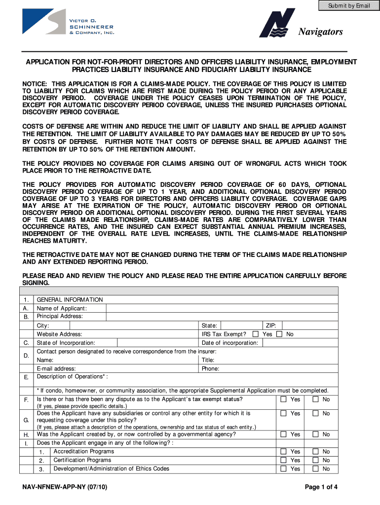 Submit by Email Navigators APPLICATION FOR NOTFORPROFIT DIRECTORS AND OFFICERS LIABILITY INSURANCE, EMPLOYMENT PRACTICES LIABILITY INSURANCE AND FIDUCIARY LIABILITY INSURANCE NOTICE: THIS APPLICATION