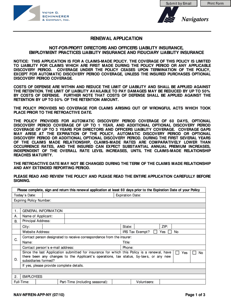Submit by Email Print Form Navigators RENEWAL APPLICATION NOTFORPROFIT DIRECTORS AND OFFICERS LIABILITY INSURANCE, EMPLOYMENT PRACTICES LIABILITY INSURANCE AND FIDUCIARY LIABILITY INSURANCE NOTICE: