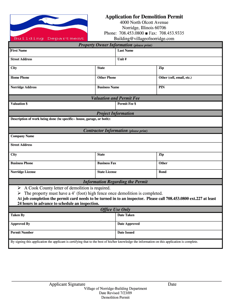 Application for Demolition Permit 4000 North Alcott Avenue Oatmeal, Illinois 60706 Phone: 708.453.0800 Fax: 708.453.9335 Building villageofnorridge.com Property Owner Information (please print) First