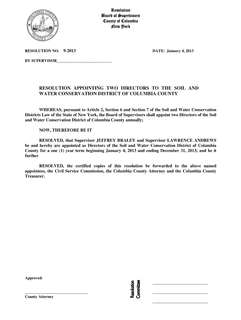 Resolution Board of Supervisors County of Columbia New York RESOLUTION NO. 92013 DATE: January 4, 2013, BY SUPERVISOR RESOLUTION APPOINTING TWO DIRECTORS TO THE SOIL AND WATER CONSERVATION DISTRICT