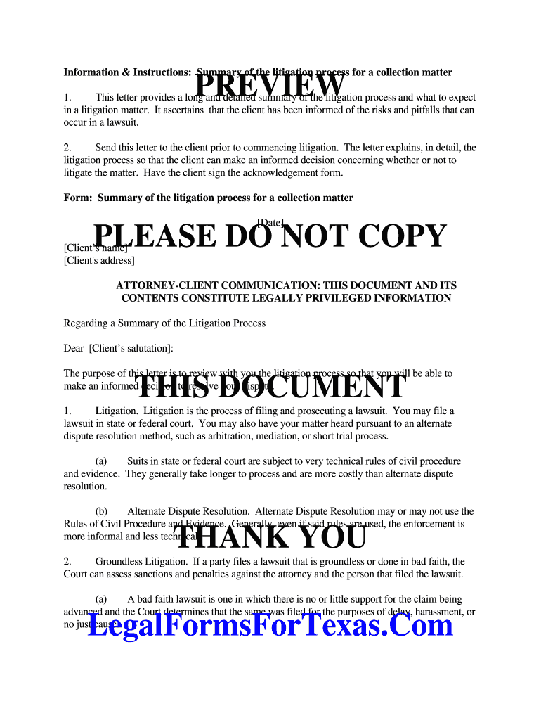 Information & Instructions: Summary of the litigation process for a collection matter PREVIEW 1. This letter provides a long and detailed summary of the litigation process and what to expect in a