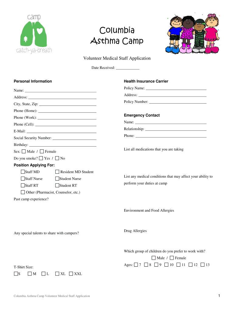 Individuals wishing to serve as volunteer medical staff at the Columbia Asthma Camp, including physicians, nurses, and other healthcare professionals, are required to file this application.