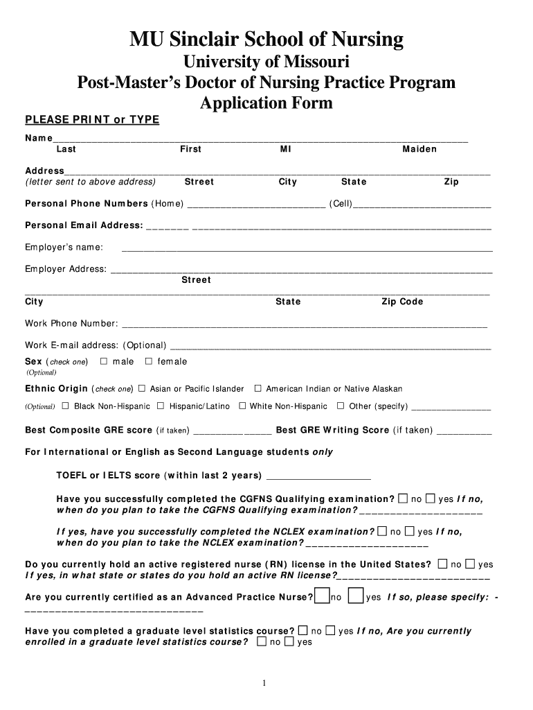 This document serves as an application form for the Post-Master’s Doctor of Nursing Practice program at the University of Missouri, including various personal, educational, and professional information