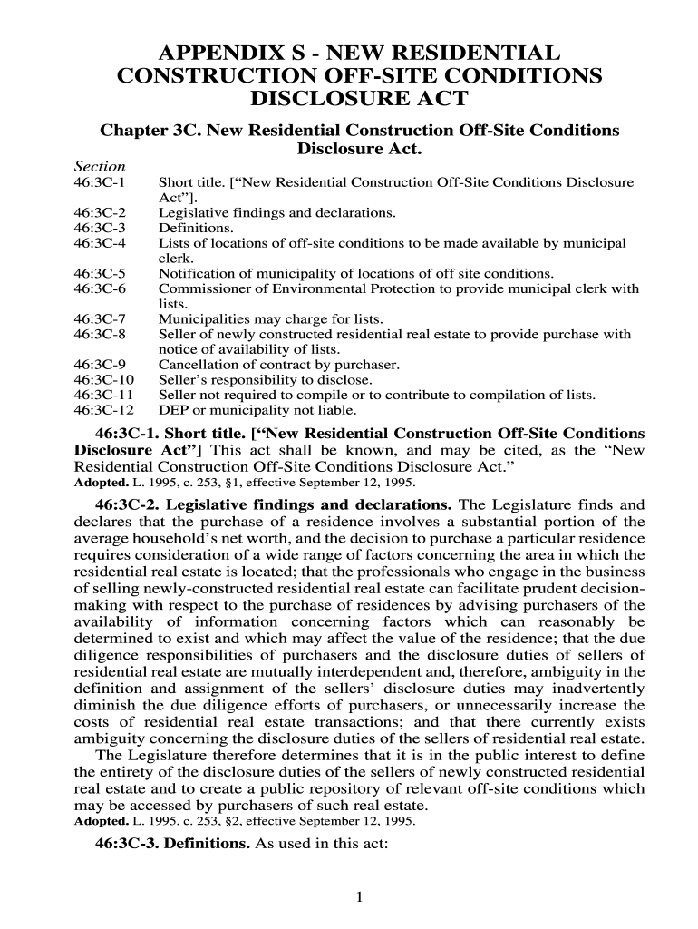 APPENDIX S NEW RESIDENTIAL CONSTRUCTION OFFSITE CONDITIONS DISCLOSURE ACT Chapter 3C. New Residential Construction Offsite Conditions Disclosure Act. Section 46:3C1 46:3C2 46:3C3 46:3C4 46:3C5 46:3C6