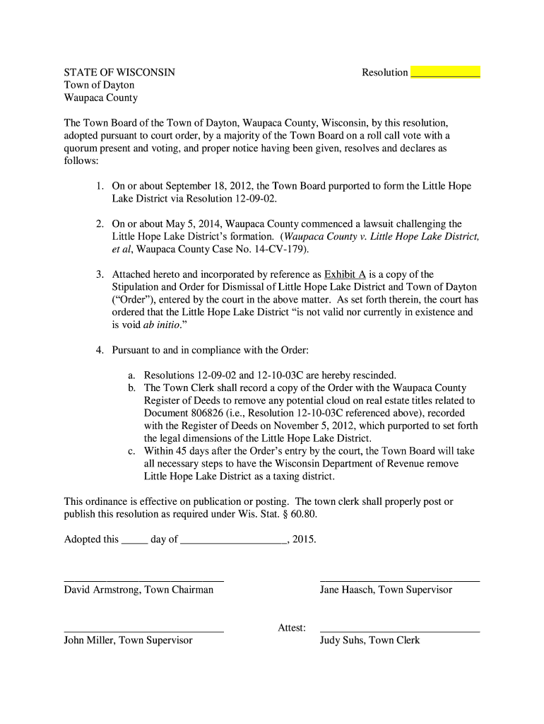 STATE OF WISCONSIN Town of Dayton Alpaca County Resolution The Town Board of the Town of Dayton, Alpaca County, Wisconsin, by this resolution, adopted pursuant to court order, by a majority of the