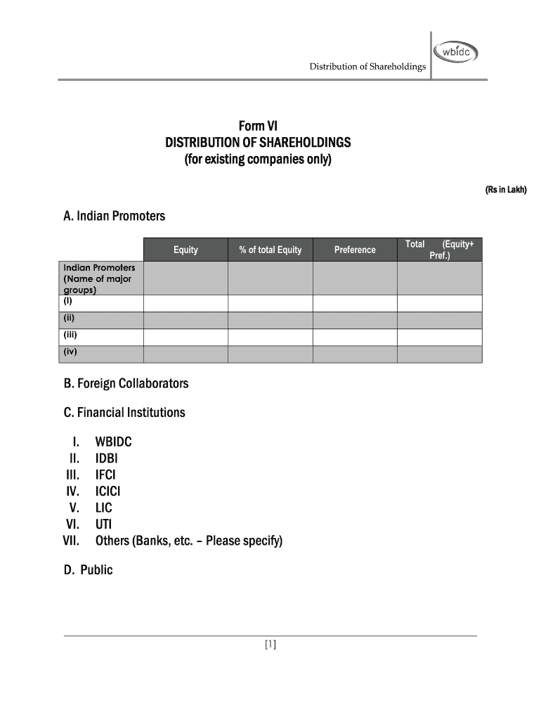 Distribution of Shareholdings Form VI DISTRIBUTION OF SHAREHOLDINGS (for existing companies only) (Rs in Lakh) A. Indian Promoters Equity % of total Equity Preference Total (Equity+ Pref.) Indian