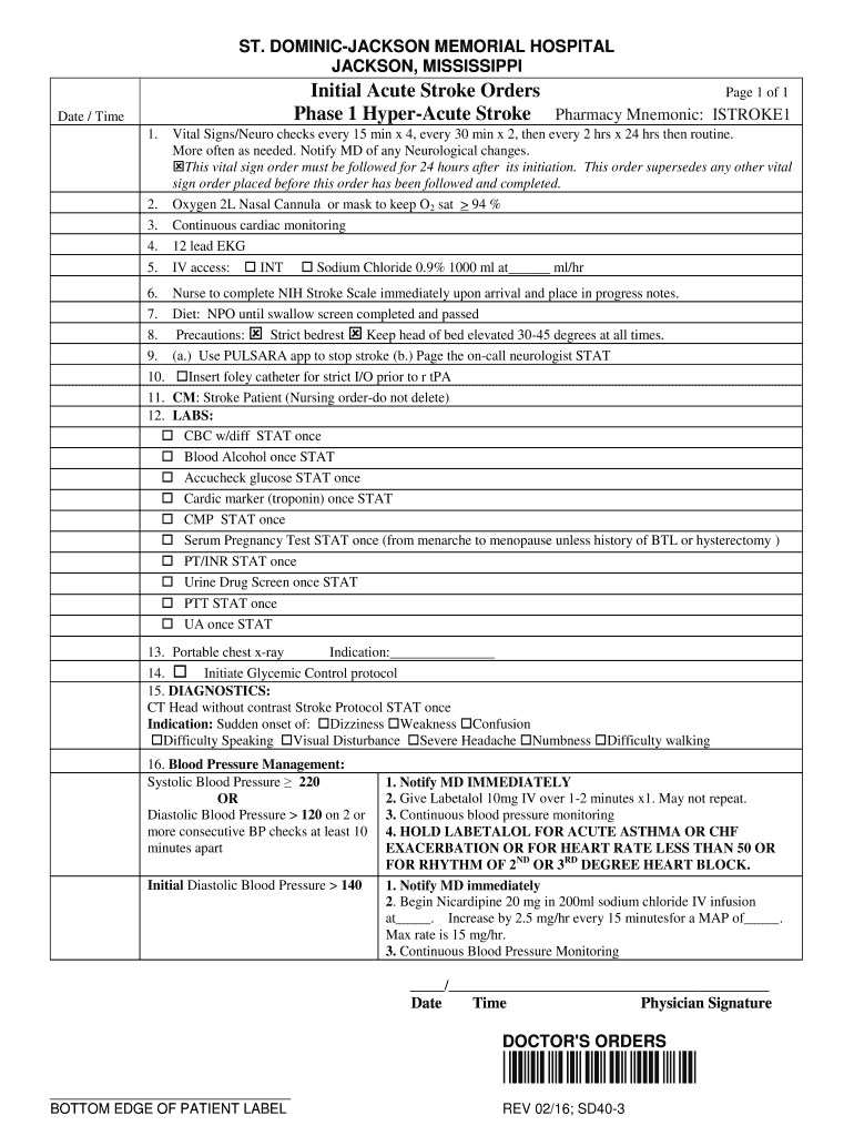 ST. DOMINICJACKSON MEMORIAL HOSPITAL JACKSON, MISSISSIPPI Initial Acute Stroke Orders Page 1 of 1 Phase 1 HyperAcute Stroke Pharmacy Mnemonic: ISTROKE1 Date / Time 1. 2. 3. 4. 5. Vital Signs/Euro