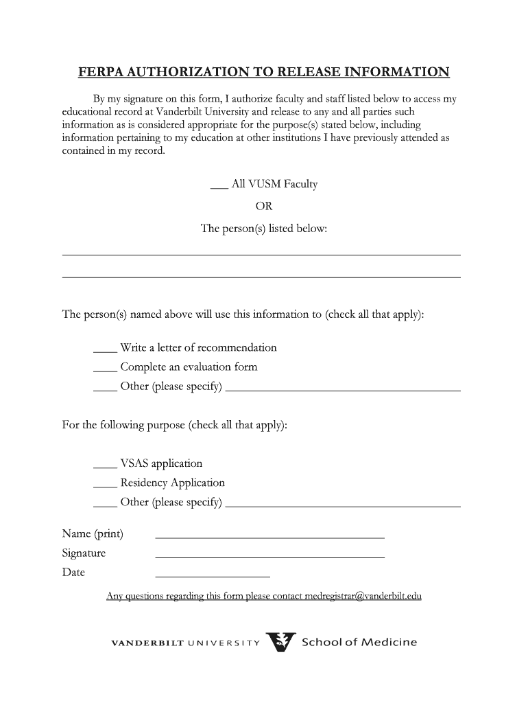 FER PA AUTHORIZATION TO RELEASE INFORMATION By my signature on this form, I authorize faculty and staff listed below to access my educational record at Vanderbilt University and release to any and