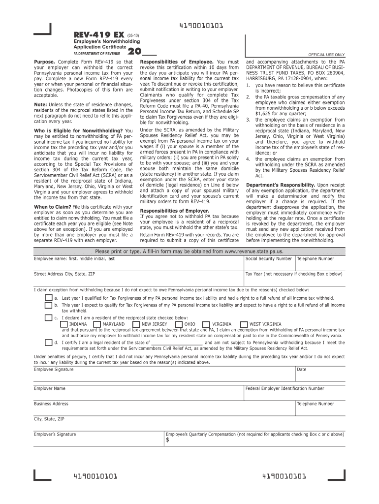 Employers who have one or more employees must use the rev-419 ex 05-10 form to gather and report relevant employee information.