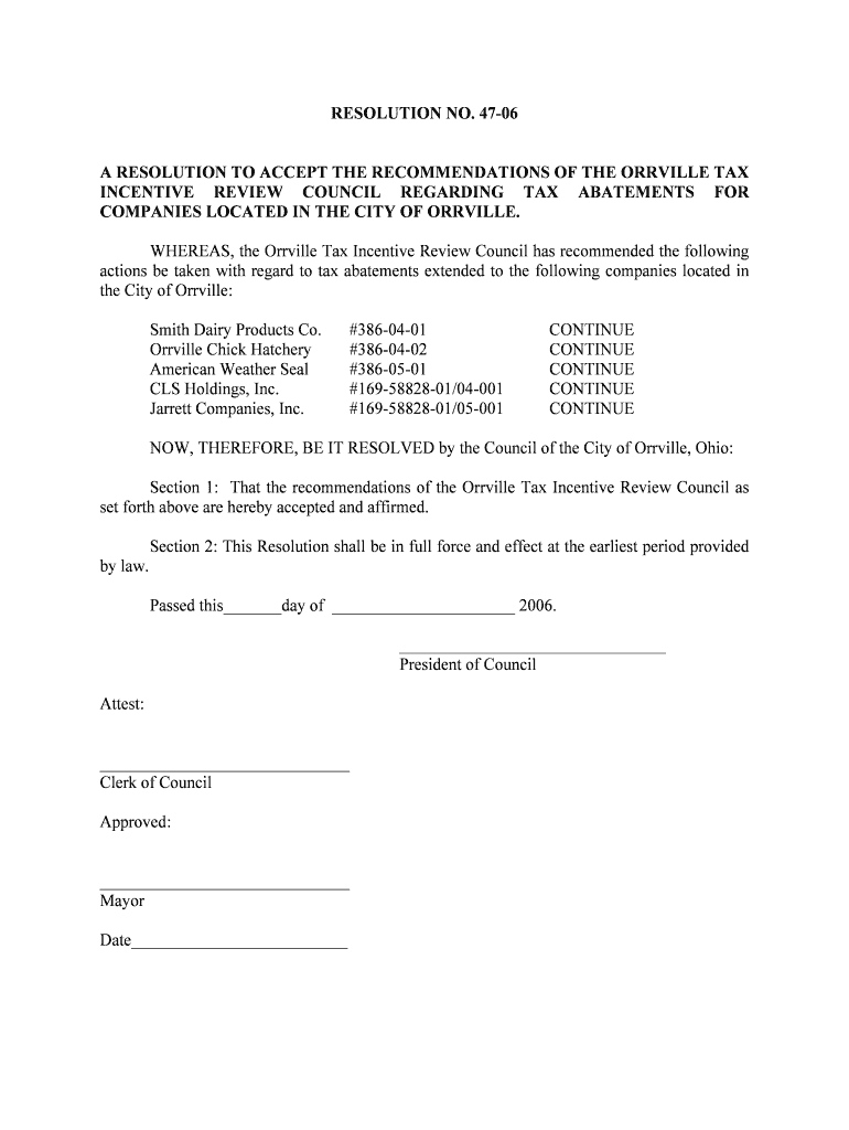 RESOLUTION NO. 4706 A RESOLUTION TO ACCEPT THE RECOMMENDATIONS OF THE ORVILLE TAX INCENTIVE REVIEW COUNCIL REGARDING TAX ABATEMENT FOR COMPANIES LOCATED IN THE CITY OF ORVILLE. WHEREAS, the Orville
