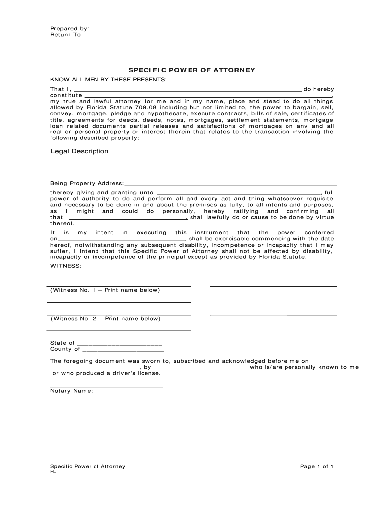 Prepared by: Return To: SPECIFIC POWER OF ATTORNEY KNOW ALL MEN BY THESE PRESENTS: That I, do hereby constitute, my true and lawful attorney for me and in my name, place and stead to do all things