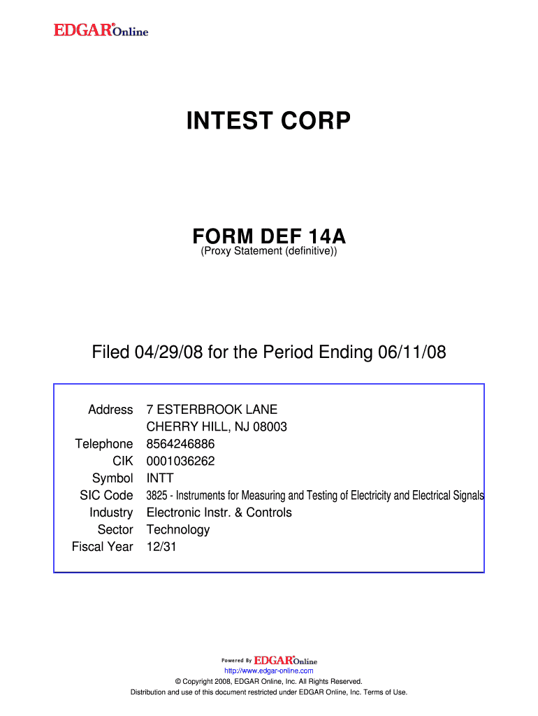 Get the free INTEST CORP FORM DEF 14A Proxy Statement definitive Filed 042908 for the Period Endi...
