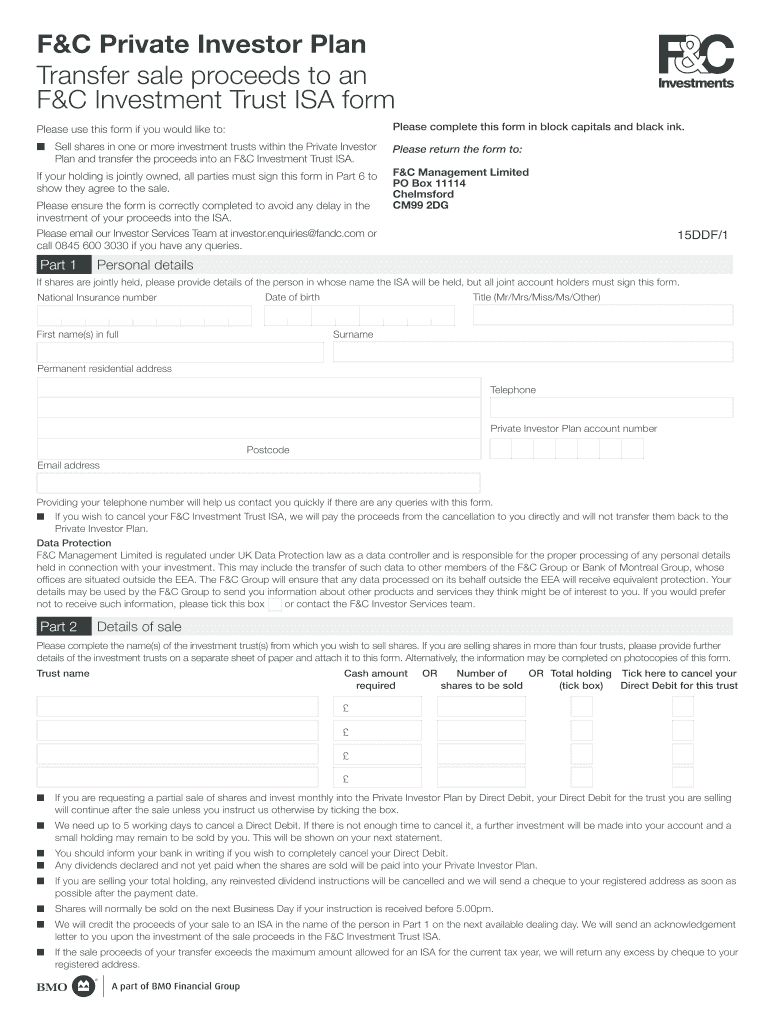 F&C Private Investor Plan Transfer sale proceeds to an F&C Investment Trust ISA form Please use this form if you would like to: Please complete this form in block capitals and black ink. N Sell shares