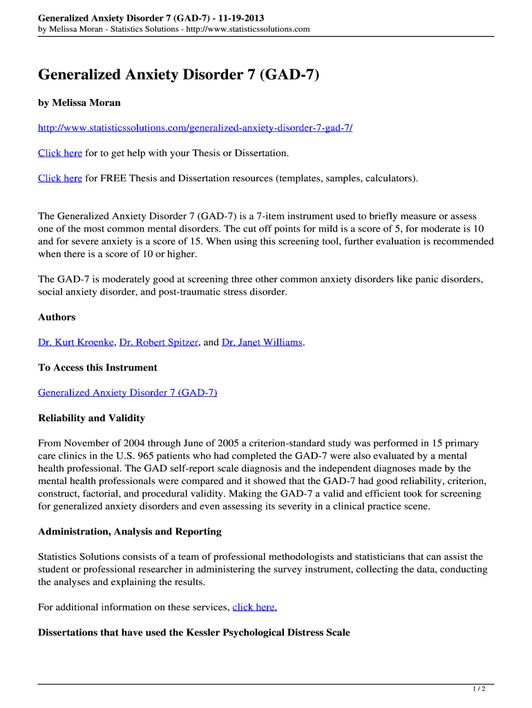 Generalized Anxiety Disorder 7 (GAD7) 11192013 by Melissa Moran Statistics Solutions http://www.statisticssolutions.comGeneralized Anxiety Disorder 7 (GAD7) by Melissa Moran http://www.statisticssolutions.com/generalizedanxietydisorder7gad7/