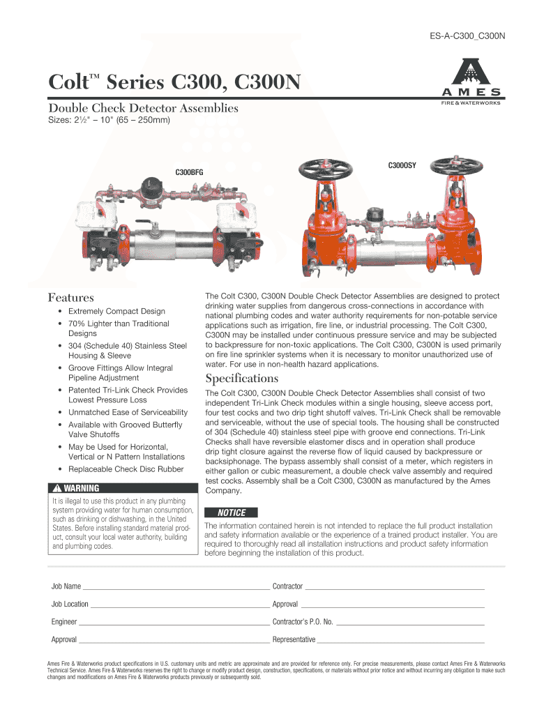 ES-A-C300 C300N Colt Series C300, C300N TM Double Check Detector Assemblies Sizes: 21 2" 10" (65 250 mm) C300OSY C300BFG Features Extremely Compact Design 70% Lighter than Traditional Designs 304