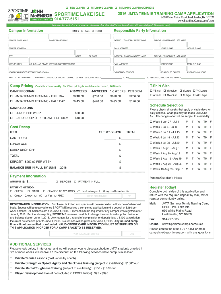 NEW CAMPER RETURNING CAMPER w/CHANGES 2016 MTA TENNIS TRAINING CAMP APPLICATION SPORTIVE LAKE ISLE 660 White Plains Road, Eastchester, NY 10709 www.SportimeCamps.com/LIsle 9147775151 In order for