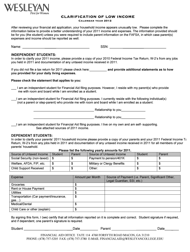 The Clarification of Low Income Form is a financial aid application document used by students to provide additional financial information to support their aid requests.