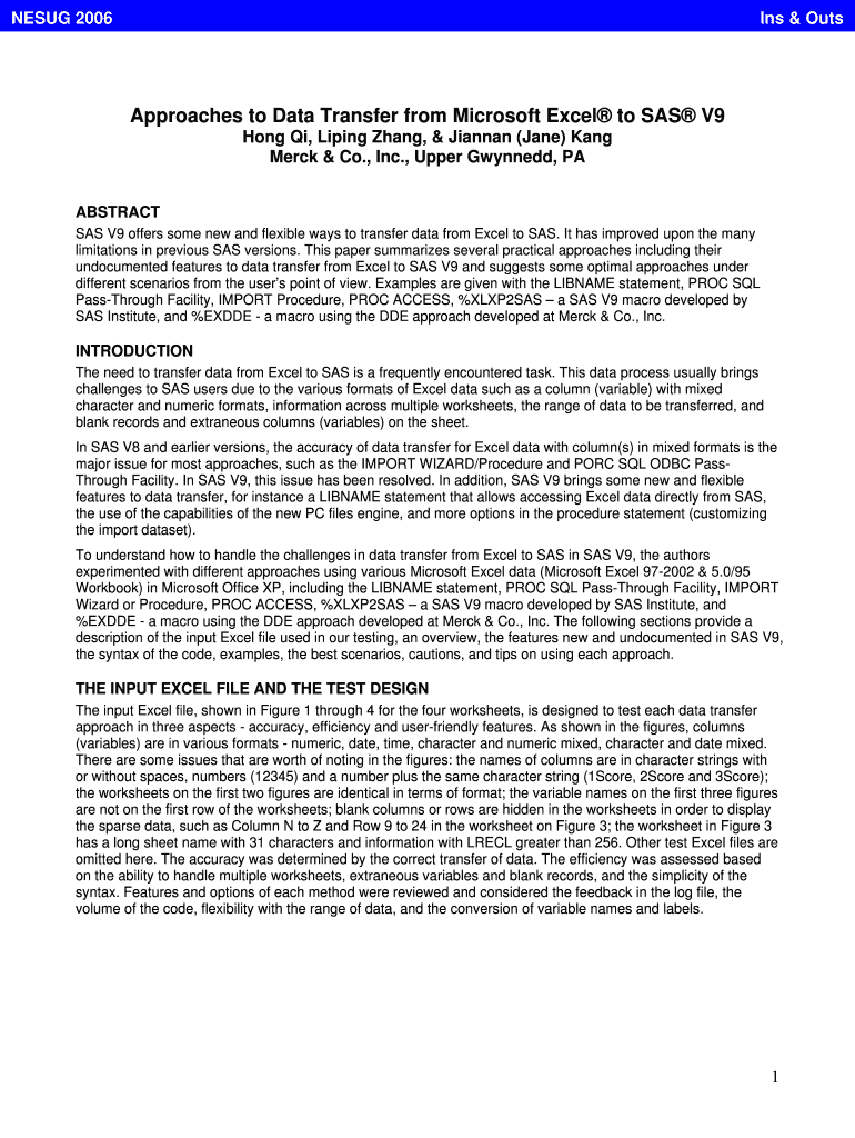 JESUS 2006Ins & OutsApproaches to Data Transfer from Microsoft Excel to SAS V9 Hong QI, Living Zhang, & Joanna (Jane) King Merck & Co., Inc., Upper Gunned, PA ABSTRACT SAS V9 offers some new and flexible