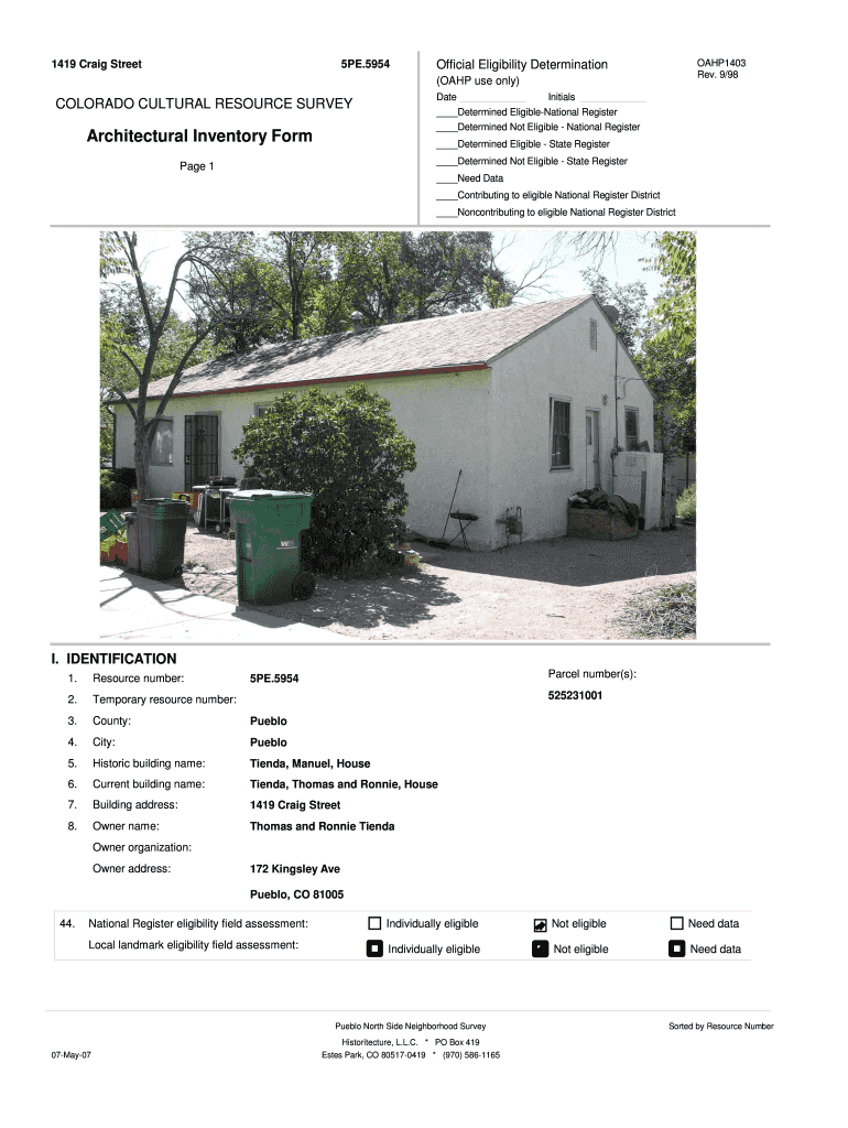 1419 Craig Street 5PE.5954 OAHP1403 Rev. 9/98 Official Eligibility Determination (OAHU use only) Date COLORADO CULTURAL RESOURCE SURVEY Initials Determined EligibleNational Register Determined Not